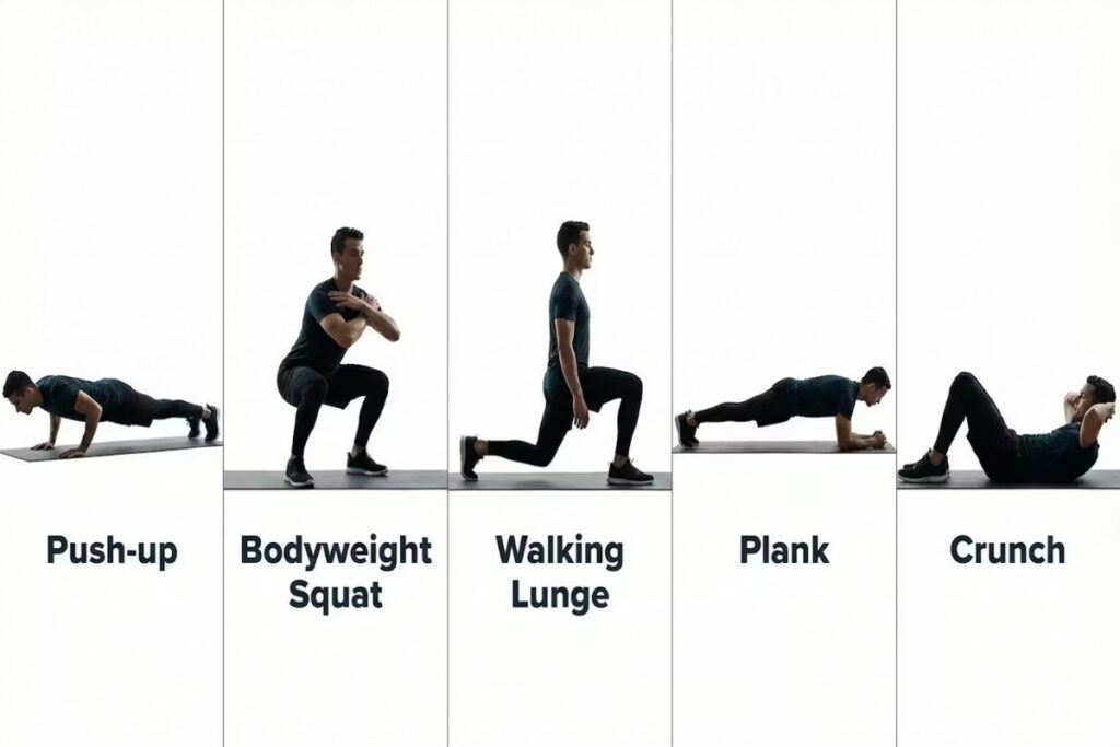 Push-ups, squats, lunges, planks, rows, and calf raises are excellent starting points. Full-body circuits combining multiple exercises are particularly effective because they train different muscle groups to manage fatigue simultaneously.