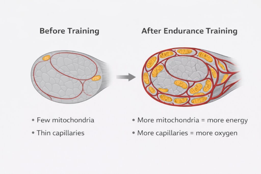 These adaptations are supported by the American College of Sports Medicine (ACSM) and a 2015 review linking endurance training to improved mitochondrial function and muscle blood circulation.