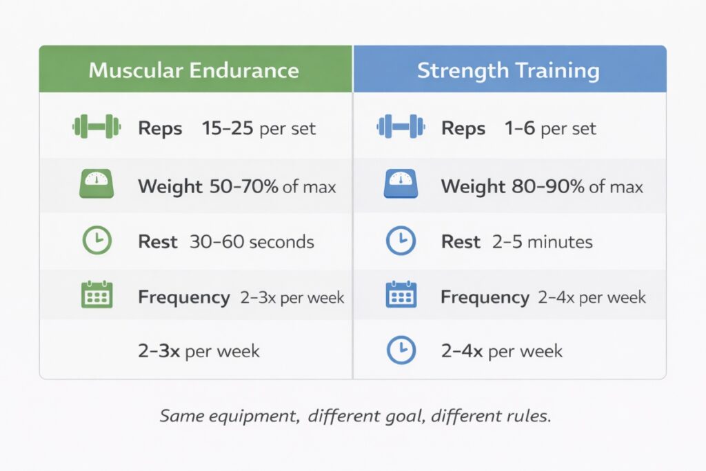 Strength is about how much force a muscle can produce in one effort. Endurance is about how many times it can produce force repeatedly. They require different rep ranges, rest periods, and weights — and training one doesn’t automatically improve the other.